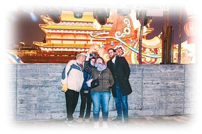 1月1日,陕西省西安市举办2026“长安灯会·西安城墙”新春系列文化活动,外国游客登城墙、赏花灯。