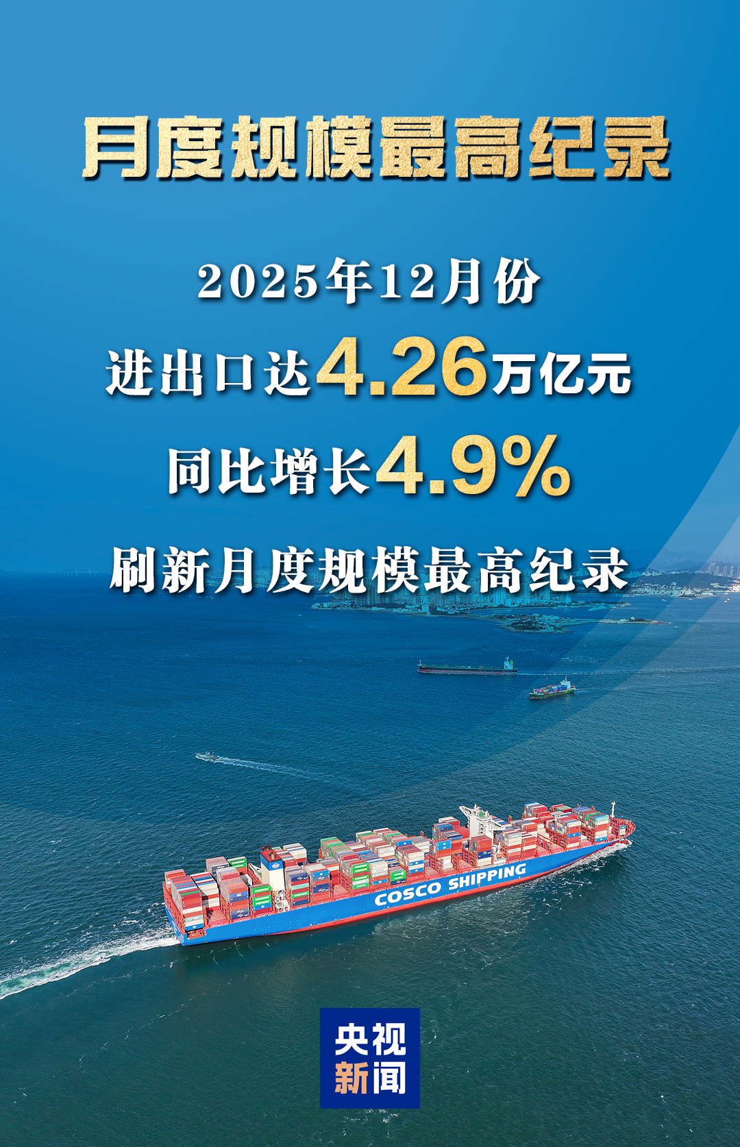 时刻新闻 —分享— 据海关统计,2025年我国外贸进出口达45.47万亿元,增长3.8%。其中,出口26.99万亿元,增长6.1%;进口18.48万亿元,增长0.5%。一组图看我国2025年外贸进出口成绩单↓ 来源:央视新闻 编辑:宋芳 您已点赞 0