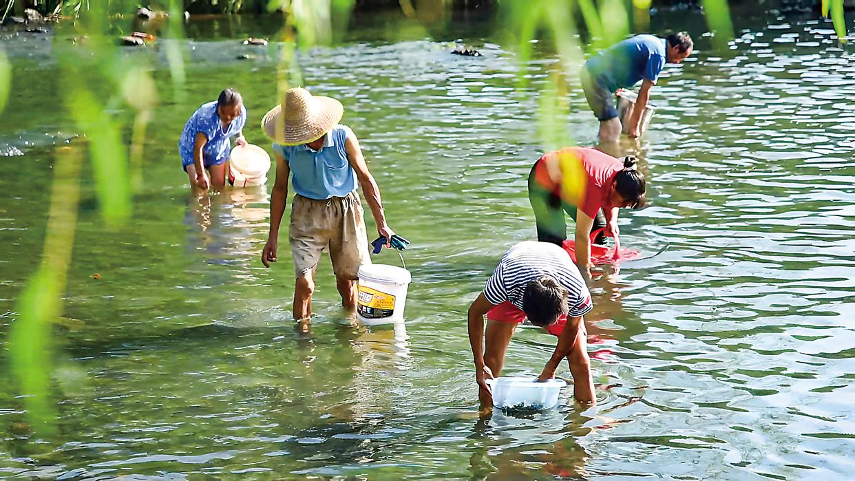 在麻溪村,村民们在水中摸嗦螺。