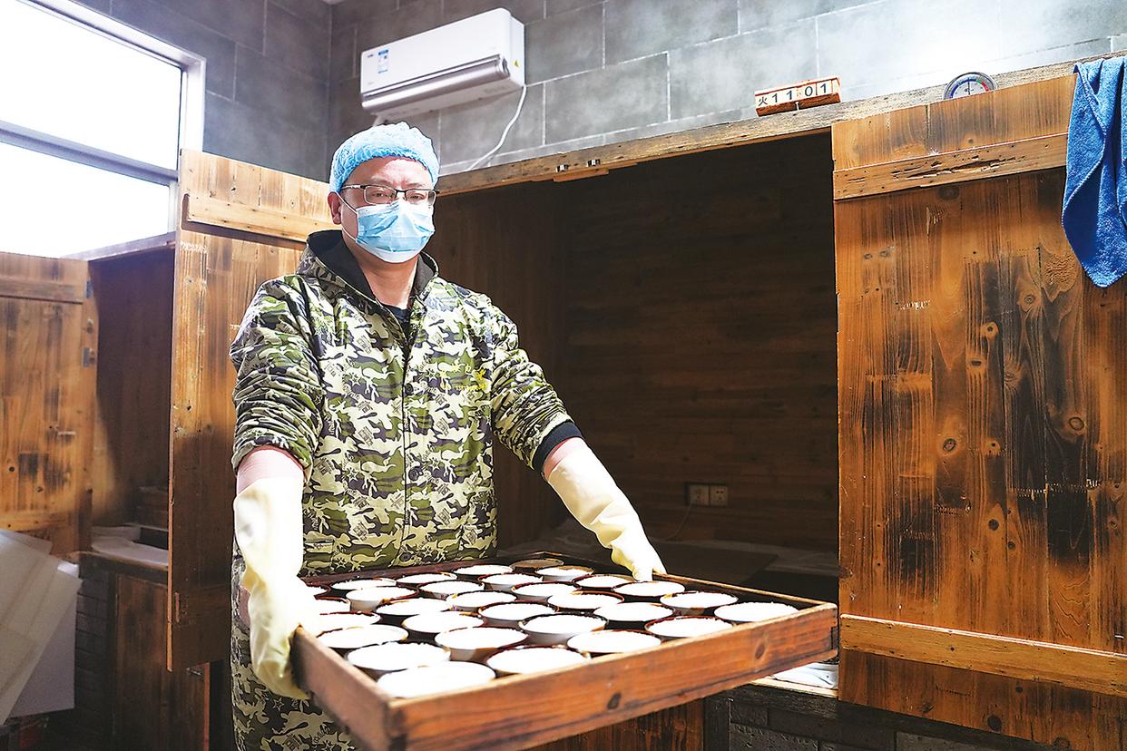 2月13日,“郭福娭毑小钵子甜酒”新的传人赵海臣从发酵间取出甜酒。