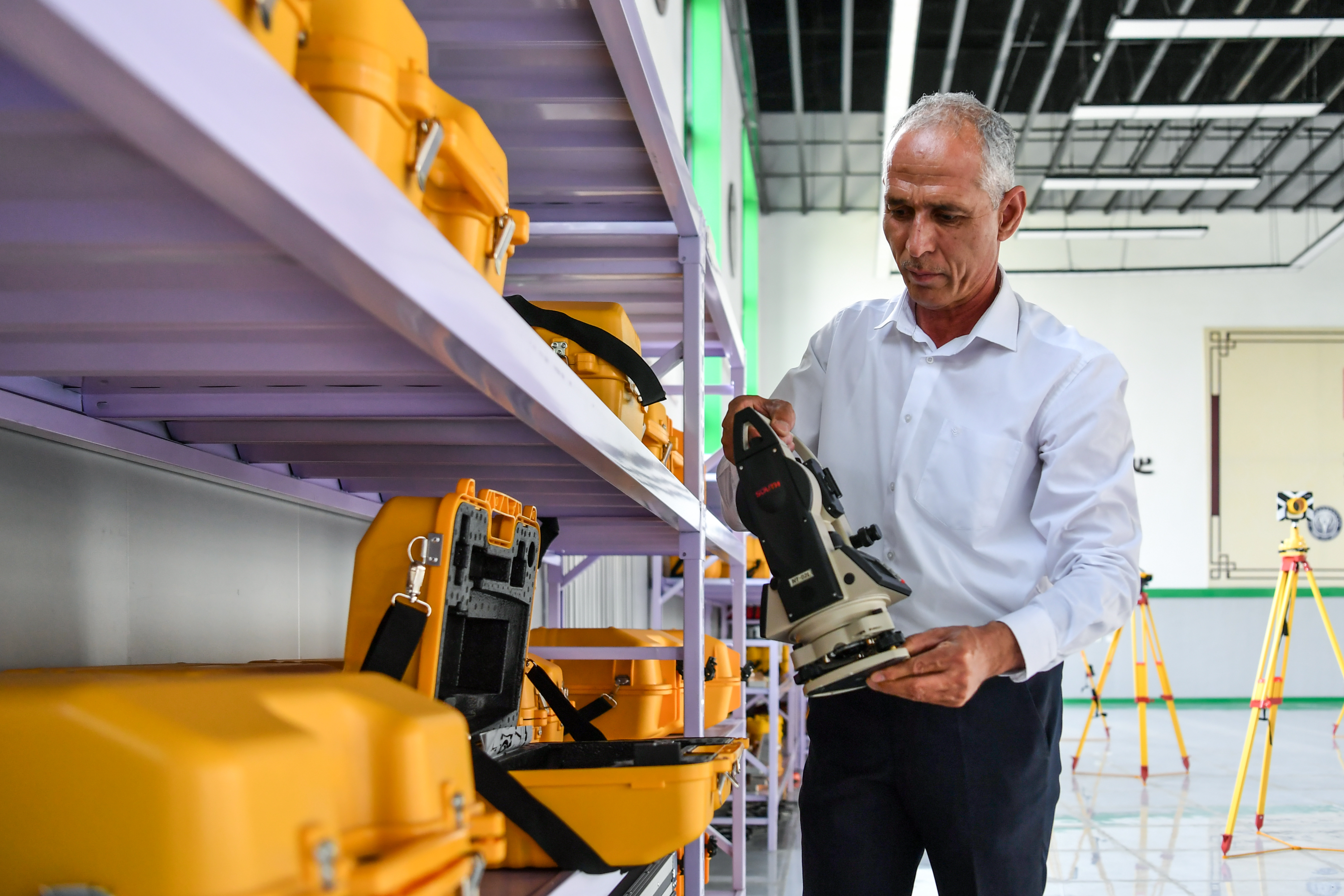 ↑7月2日,塔方老师在塔吉克斯坦首都杜尚别的鲁班工坊内检查器材。