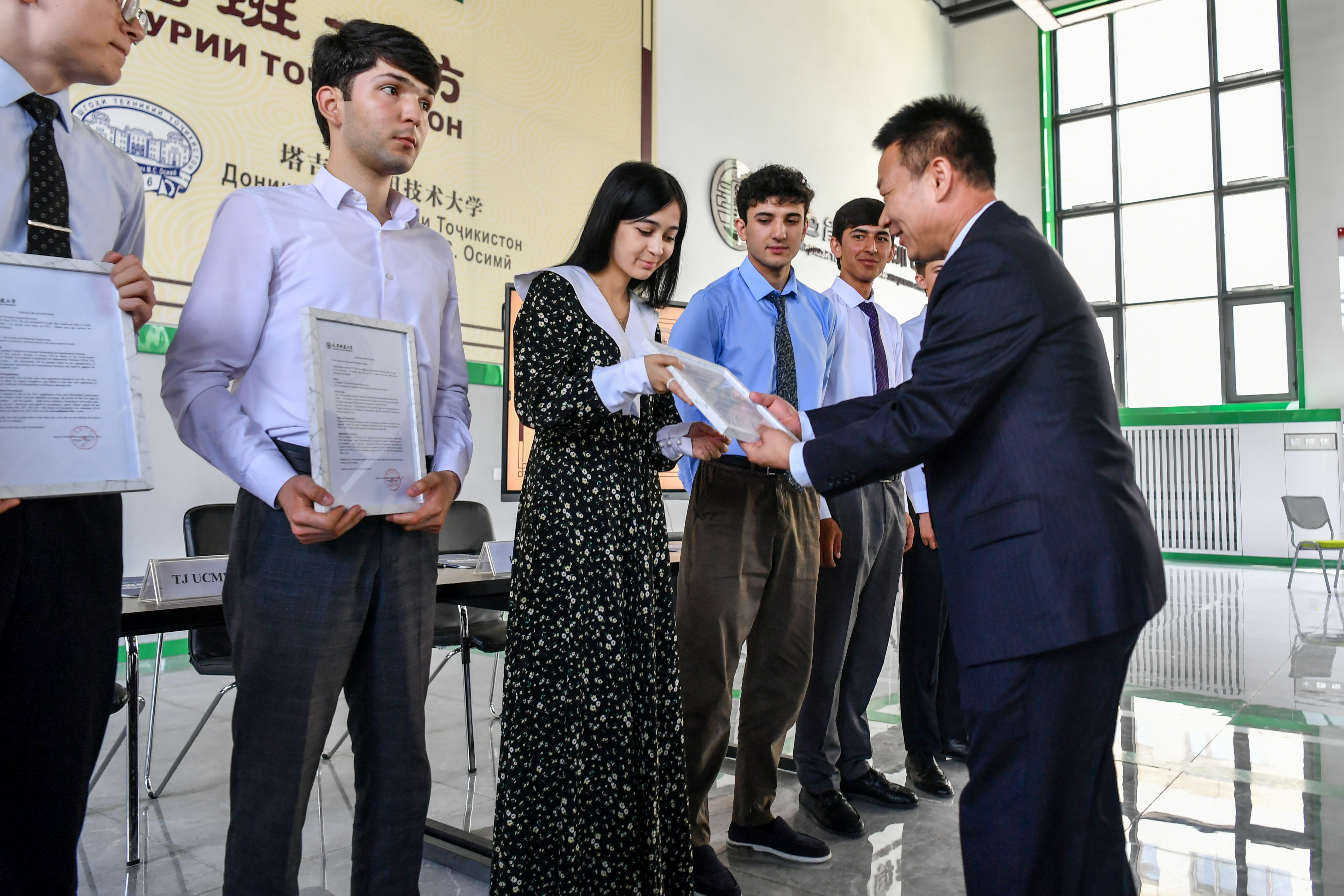 ↑7月3日,在塔吉克斯坦首都杜尚别的鲁班工坊,来自天津城市建设管理职业技术学院的负责人为赴华留学生颁发录取通知书。