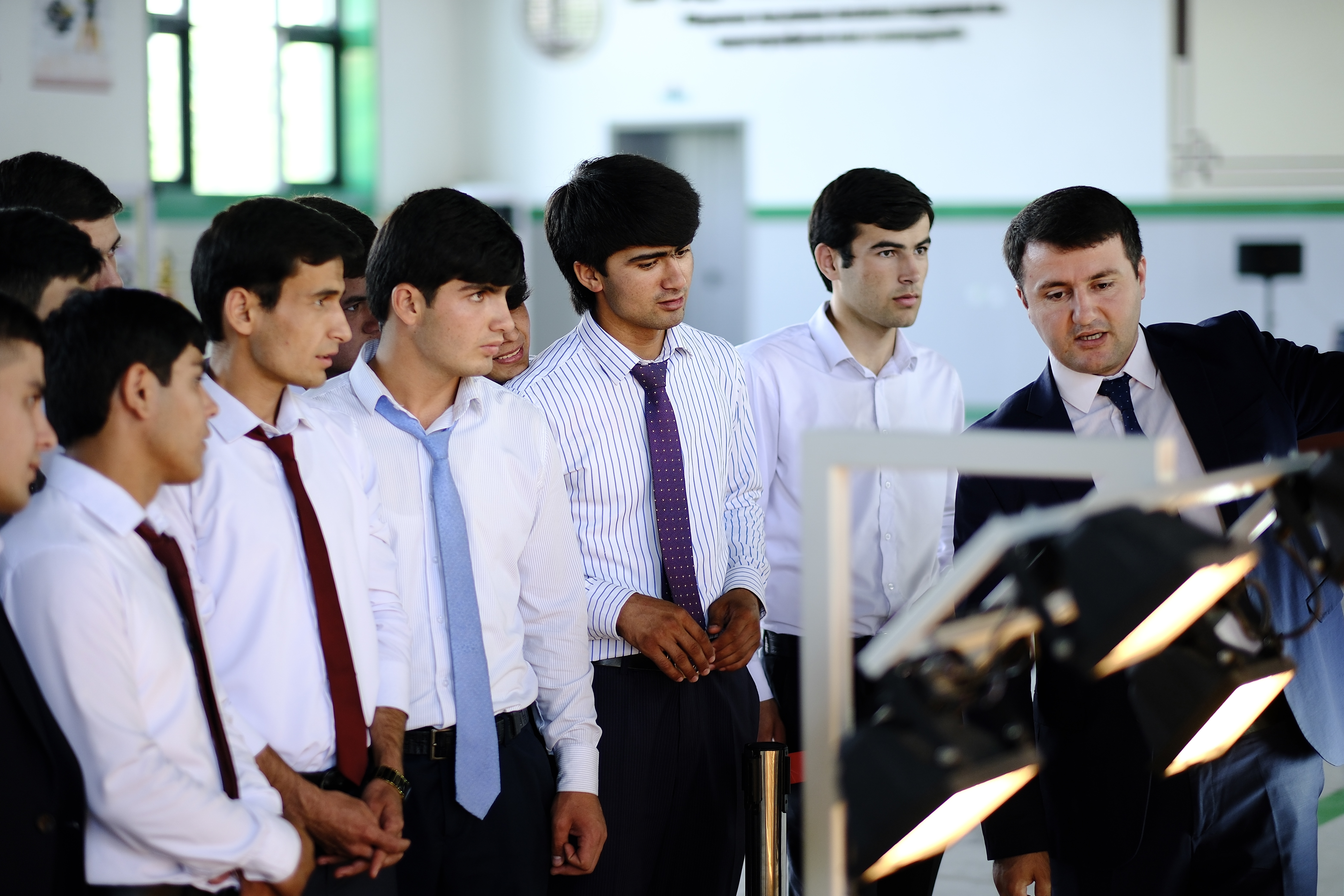 ↑6月14日,学生们在塔吉克斯坦首都杜尚别的鲁班工坊内听塔方老师讲解。