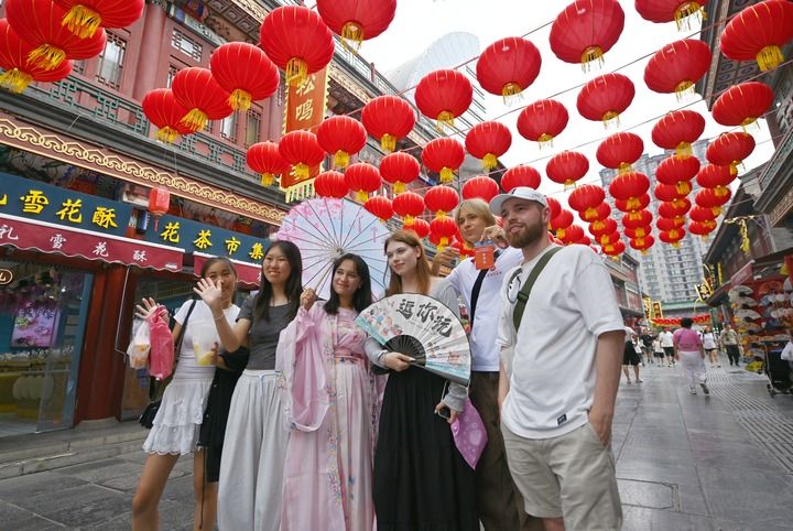 2025年8月14日,上合国家学生在天津古文化街留影。新华社记者 李然 摄