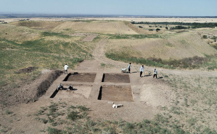 2023年8月9日,考古人员在中哈联合考古项目拉哈特遗址探方上工作(无人机照片)。新华社发(奥斯帕诺夫摄)